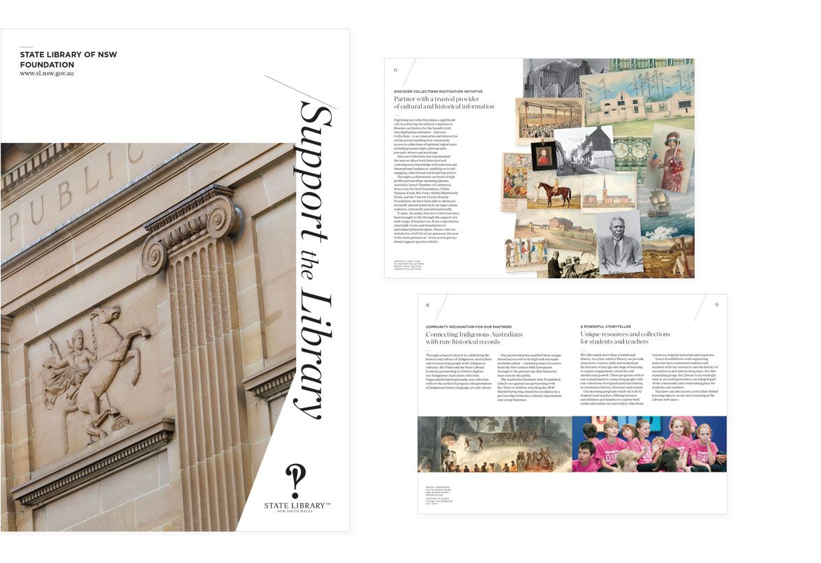 The State Library of NSW has many facets and a series of A5 brochures were designed to provide more information. Pictured below is a brochure about using the reference library to research from home and a booklet brochure encouraging people to support the library.